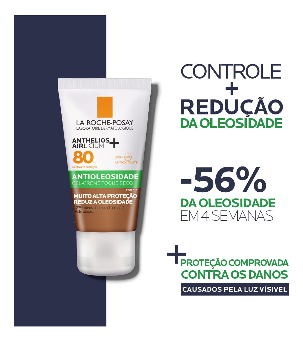 Protetor solar facial com cor. La Roche-Posay Anthelios Airlicium FPS80 protege e oferece um tratamento que reduz a oleosidade em 27% em apenas uma semana e 56% em um mês.