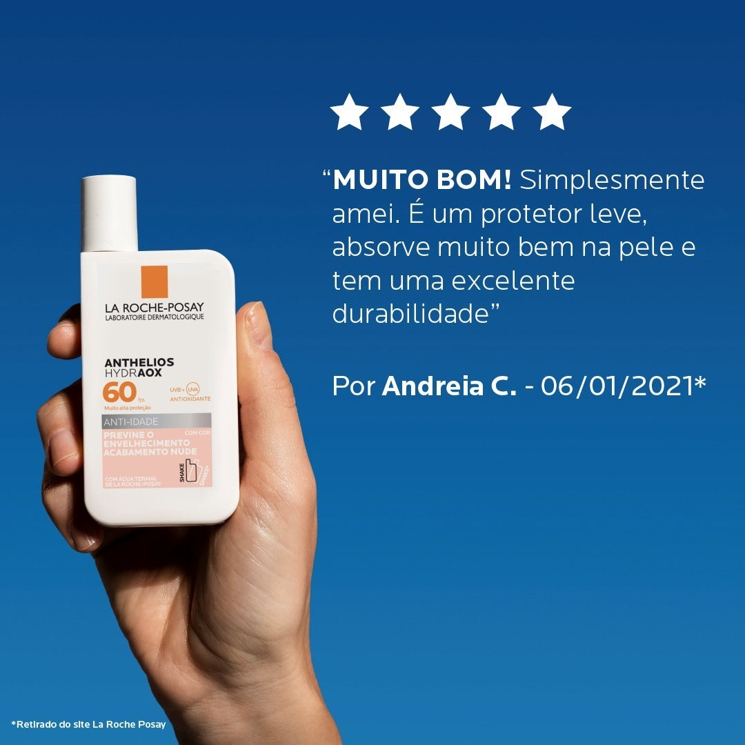 Ultra resistente à água e com acabamento nude, Protetor Solar La Roche-Posay Anthelios Hydraox disfarça as imperfeições e possui textura fluida que absorve rapidamente no rosto, sem deixar uma sensação pegajosa. Além disso, apresenta fórmula com complexo antioxidante de alta eficácia, que oferece ação Redutor de Linhas e proteção fotoestável contra os raios UVA, UVB e radicais livres induzidos por agentes externos.
