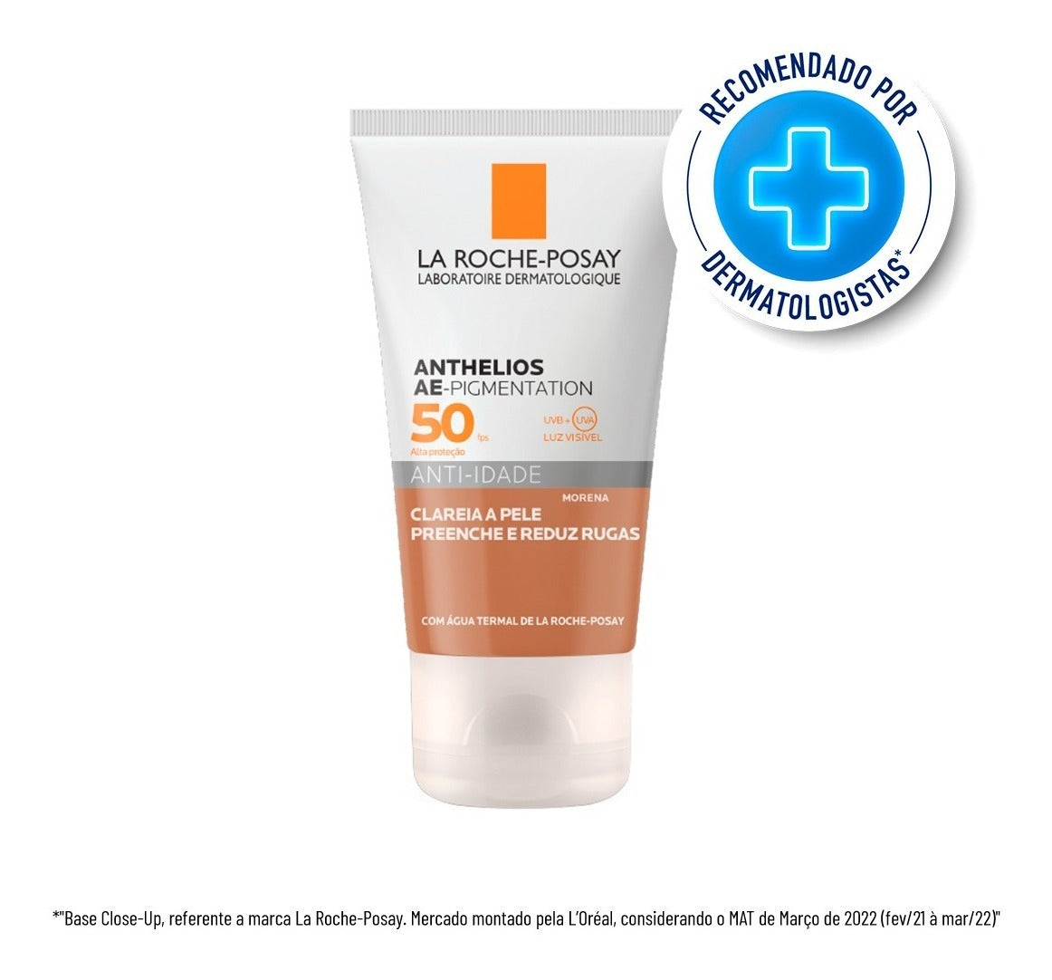 Protetor Solar La Roche-Posay Anthelios AE- Pigmentation preenche as rugas e linhas finas enquanto uniformiza o rosto. Além disso, sua fórmula possui alta resistência à água e não deixa a pele com o aspecto pegajoso ou oleoso ao longo do dia.