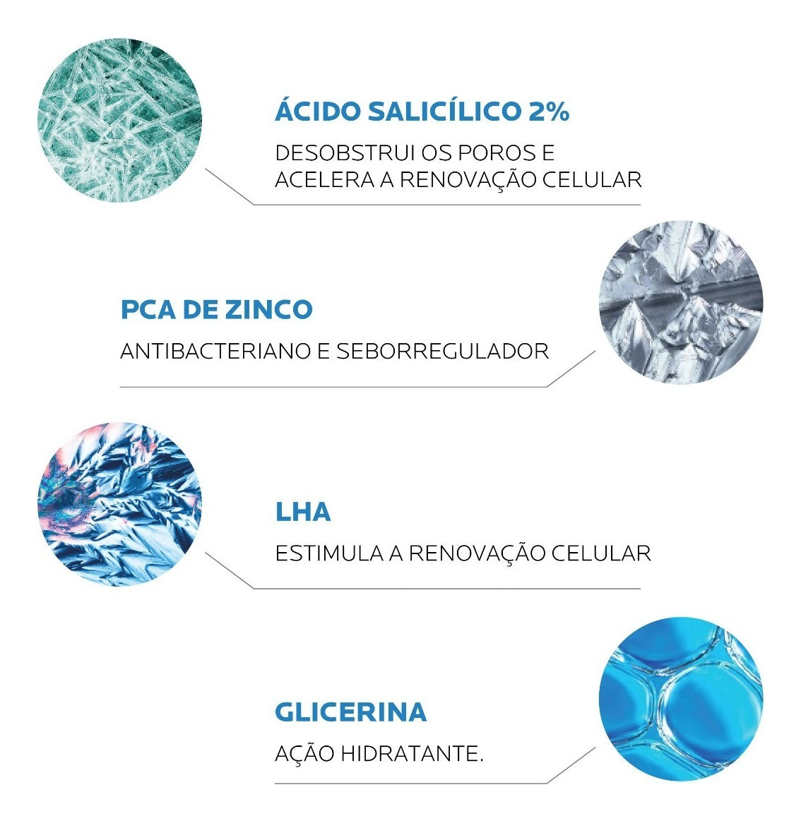 Sais de Zinco: controla a produção de queratina da pele que obstrui os poros. Assim, reduz a ocorrência de acne e regula a oleosidade.